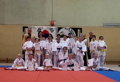 Elisa Brennecken und Gunnar Dalhoff, die beide ihre erste Prüfung ablegten, konnten die einmalige Möglichkeit nutzen durch ihre gute Leistung einen KUP-Grad zu überspringen und dürfen jetzt stolz den 8. KUP (Gelb-Gurt) tragen.