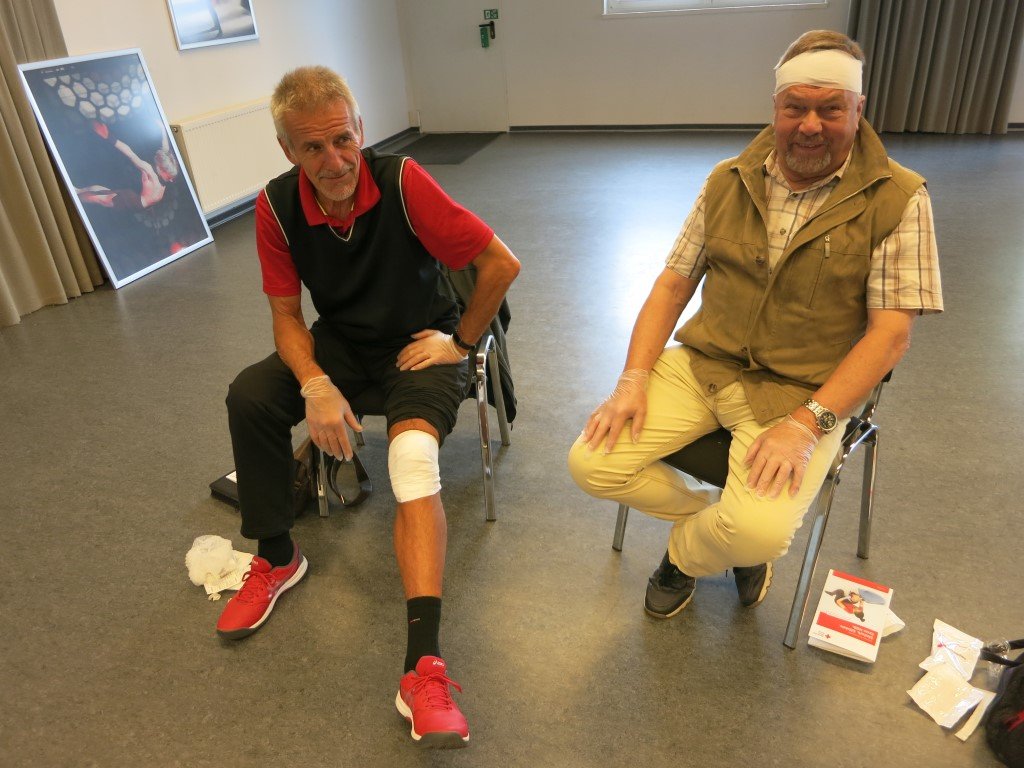 Der Kurs hat allen Beteiligten hervorragend gefallen. Sehr schön war, dass die Teilnehmenden für viele Situationen selbst Lösungsvorschläge erarbeiten sollten. Dann erprobte man die richtigen Vorgehensweisen praxisnah untereinander. Beispielsweise trug so jeder an irgendeiner Stelle (Kopf, Hals, Daumen, Finger, Arm, Ellenbogen, Knie usw.) einen geeigneten Verband. Ausfühlich erläuterte Jürgen auch Wiederbelebungsmaßnahmen. Jeder probierte sie an Dummies aus. Durch den aktiven Unterricht bleiben auch viele Details in Erinnerung.