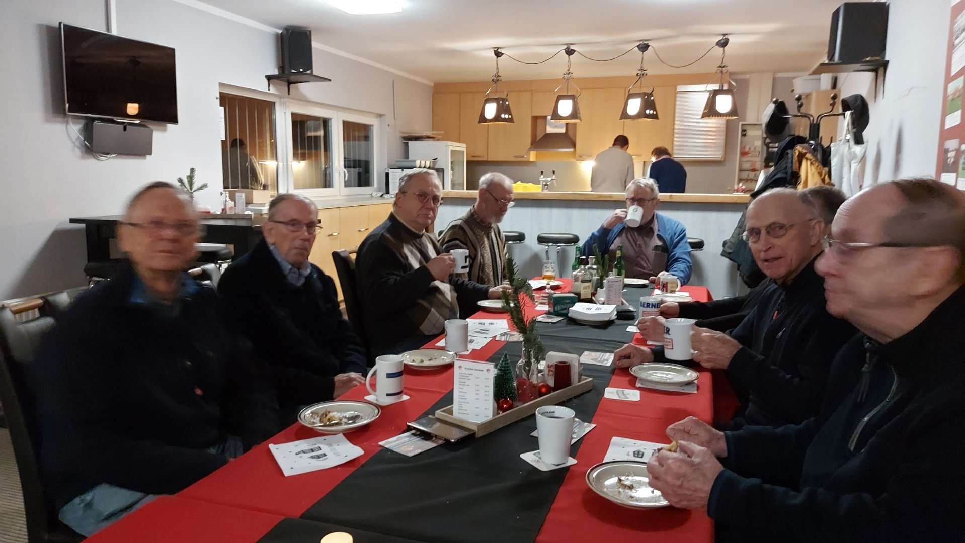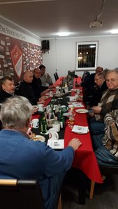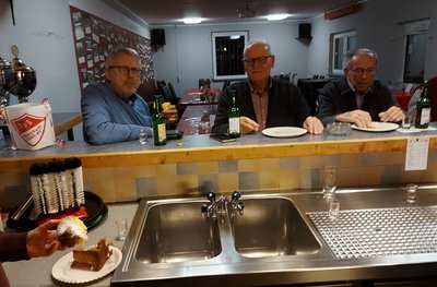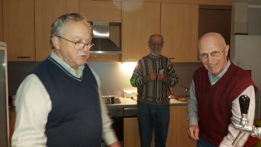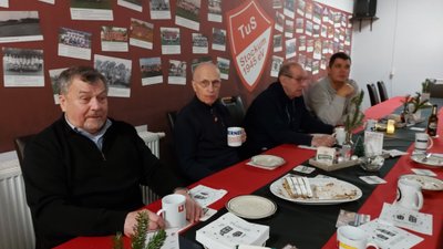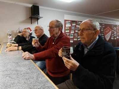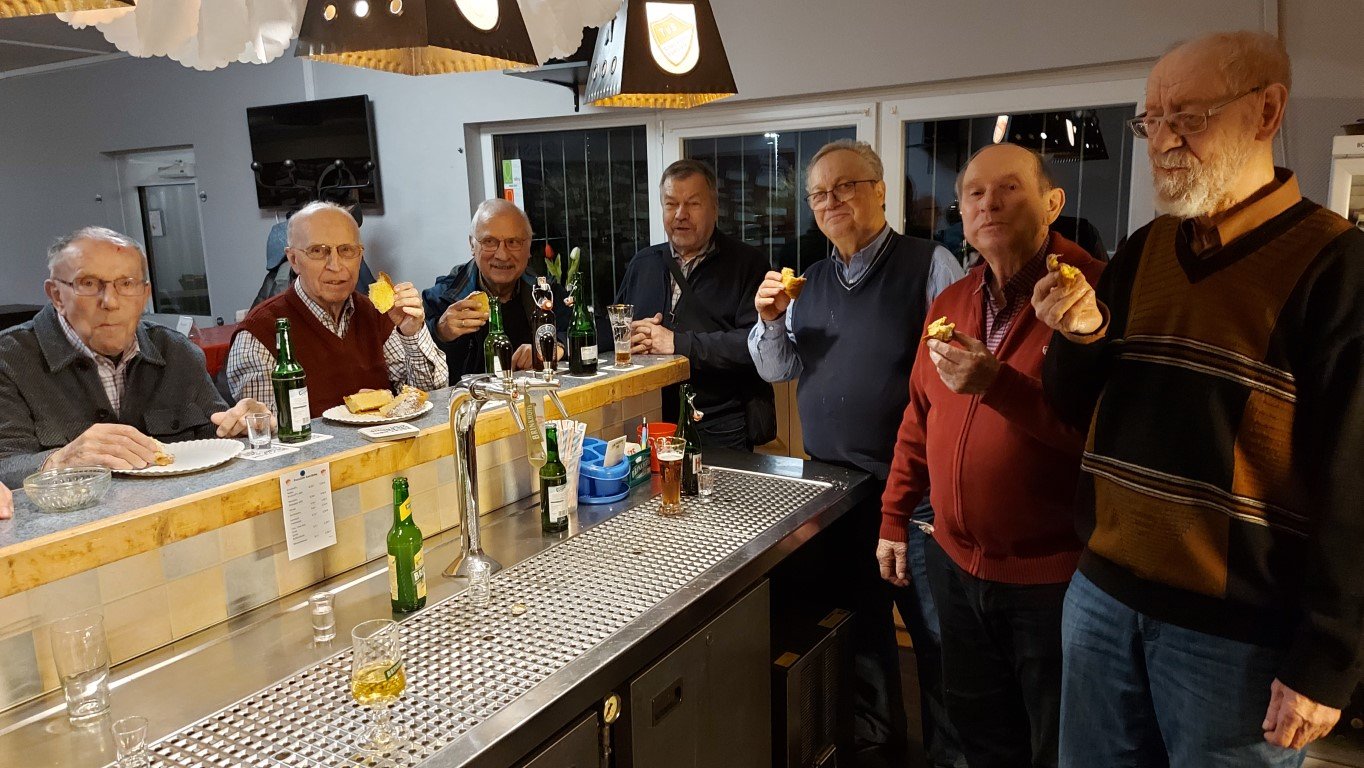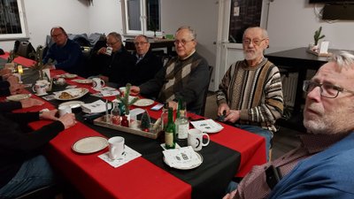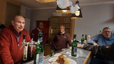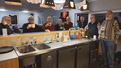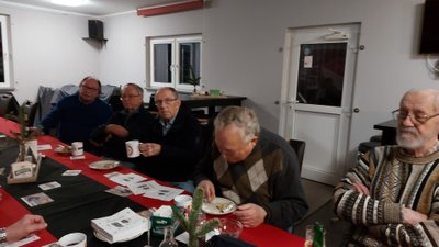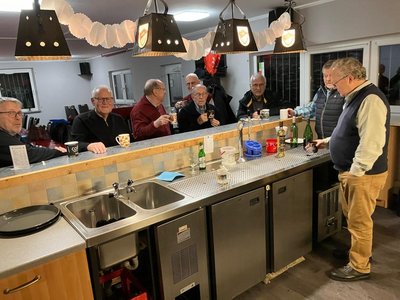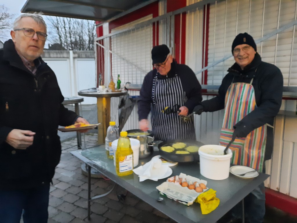 Am Montag nach dem 2. Advent war es dann mal wieder soweit. Endlich wurde das beliebte Reibekuchenessen wiederholt. Dazu trafen sich die Teilnehmer des MÄTUA-Treffs um 16 Uhr am und im FAIRPLAY. Leider regnete es fortwährend, so mussten wir - unter dem Vordach des Verkaufscontainers auf der Bezirkssportanlage geschützt - in 2 großen Elektropfannen die Reibeplätzchen backen. So schnell, wie die gegessen wurden, konnte gar nicht gebacken werden. Die „Alte Birne“ durfte selbstverständlich nicht fehlen und schließlich waren alle der Meinung, dass dieses kleine Event wiederholt werden sollte.