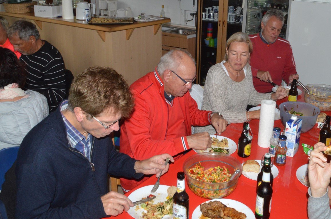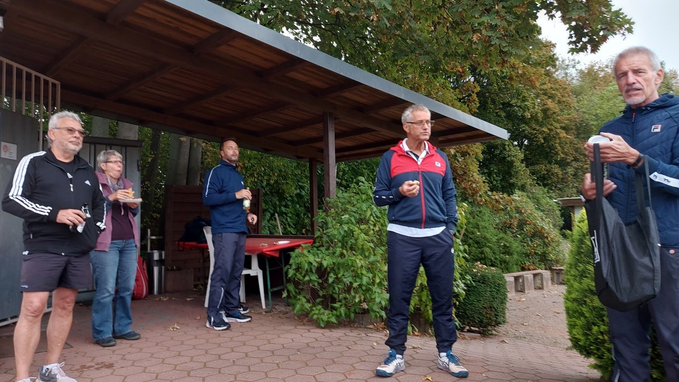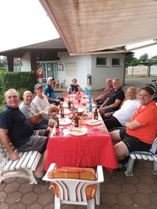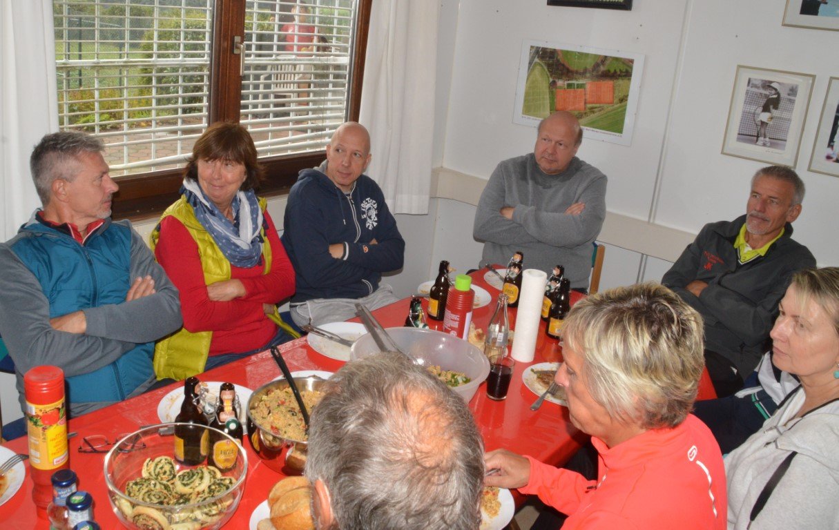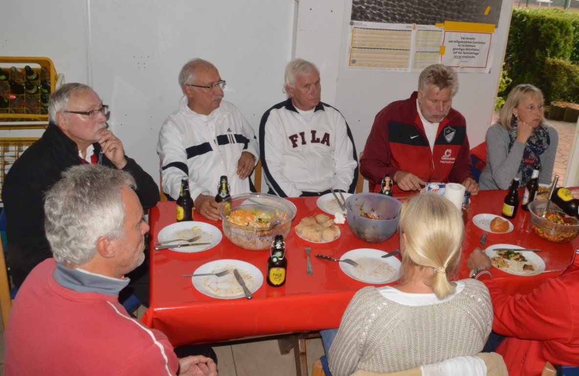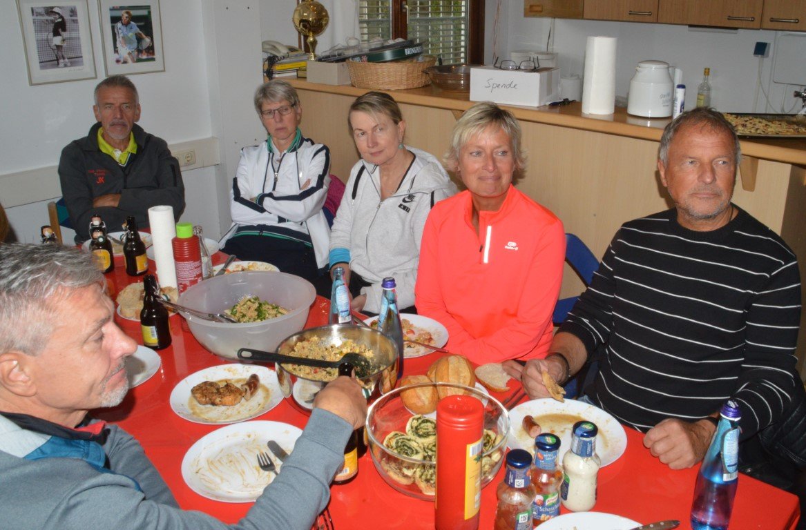 Pünktlich zum Ende des Turniers kam der angekündigte Regenschauer, der uns zum Essen und Trinken in den Container trieb. Ein reichhaltiges Buffet von mitgebrachten Salaten bis hin zu Kuchen sowie verschiedenen gegrillten Köstlichkeiten rundete ein gelungenes sportliches wie geselliges Ereignis ab. Danke allen, die dazu beigetragen haben.