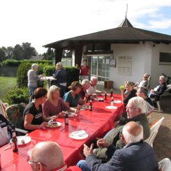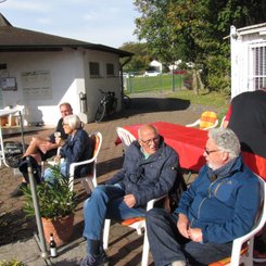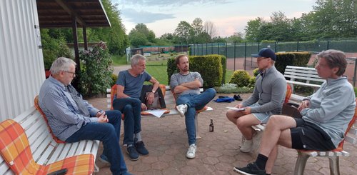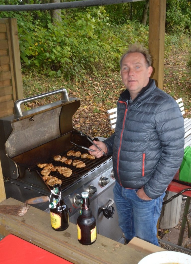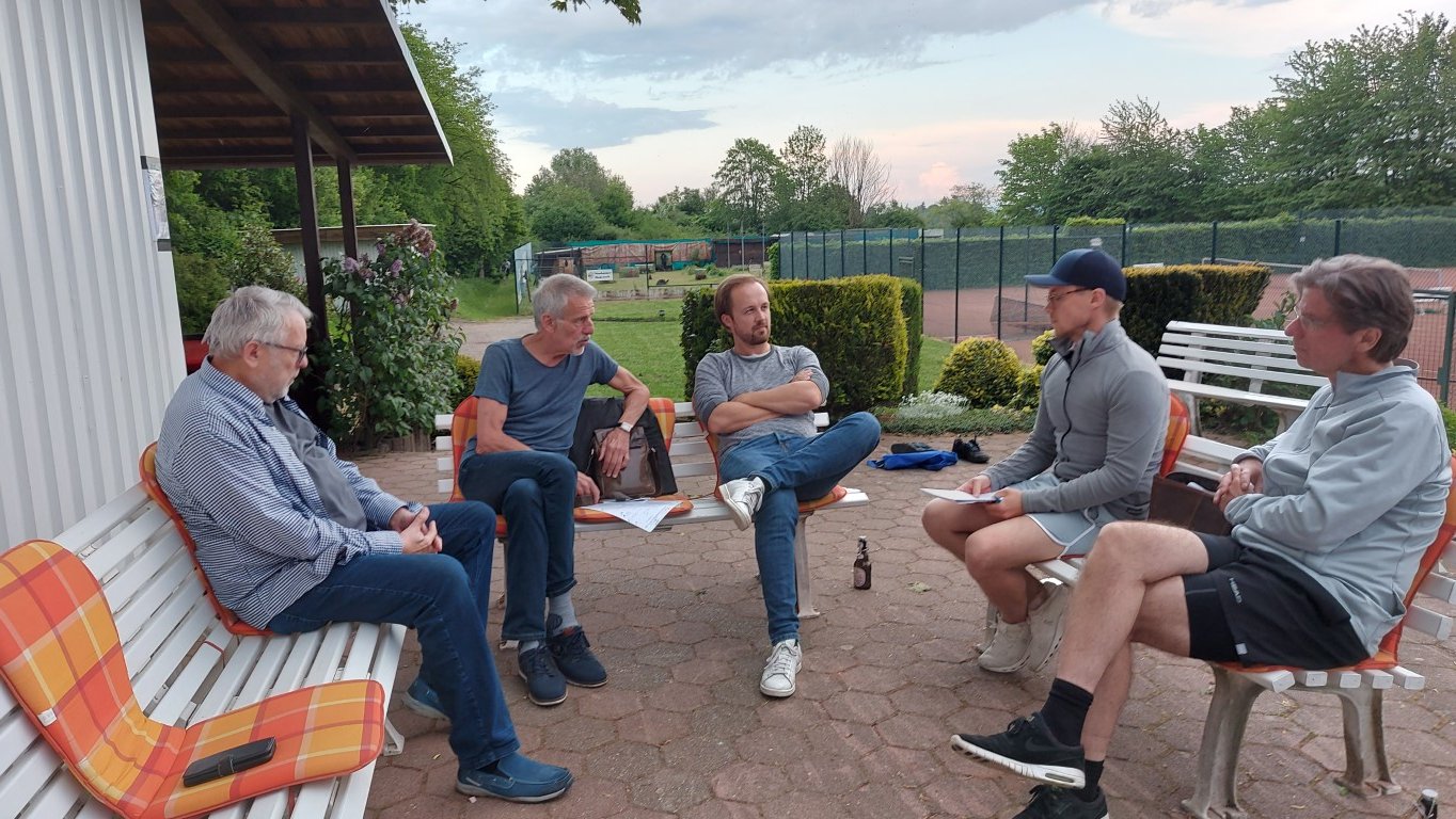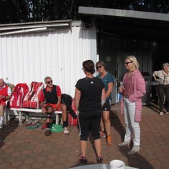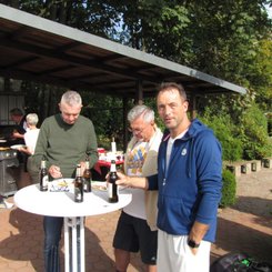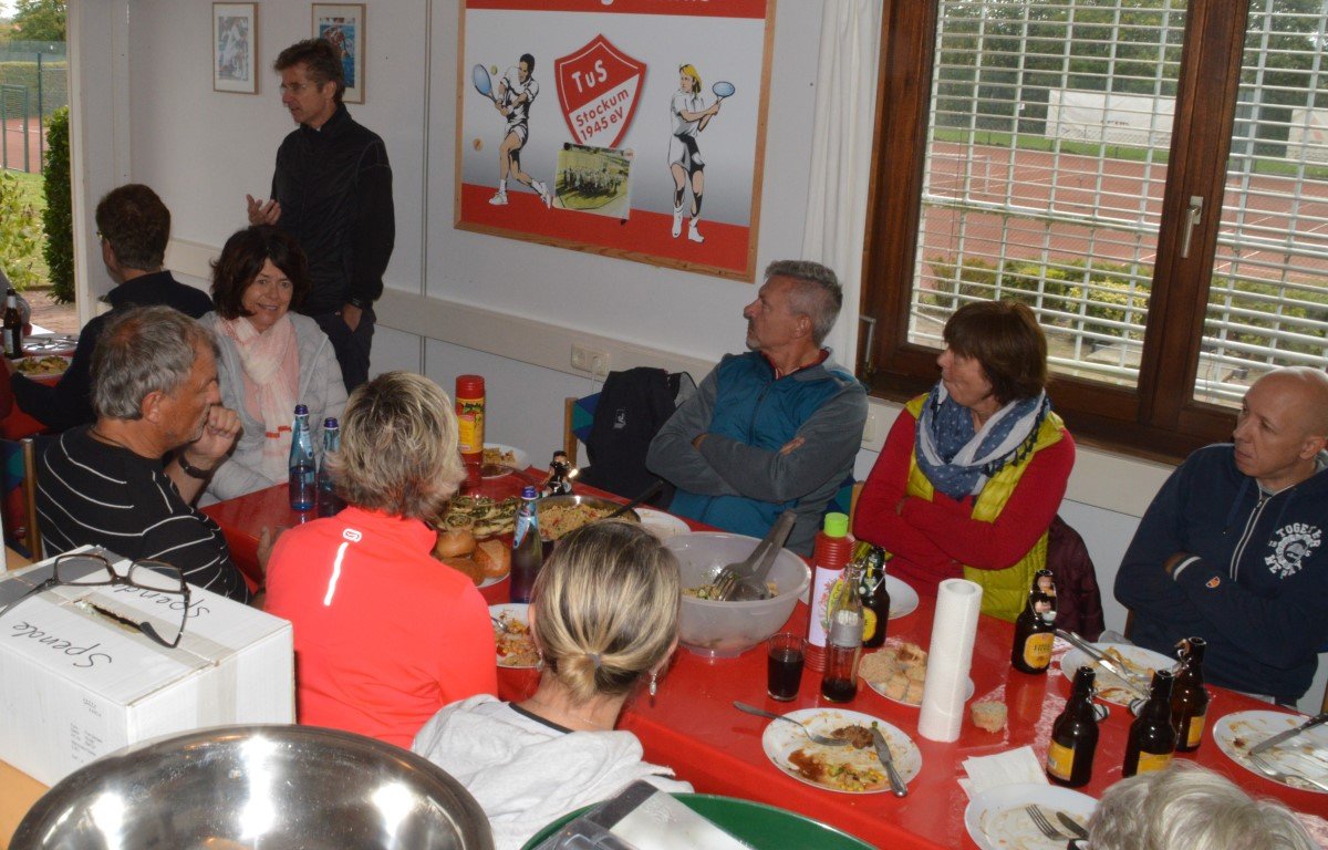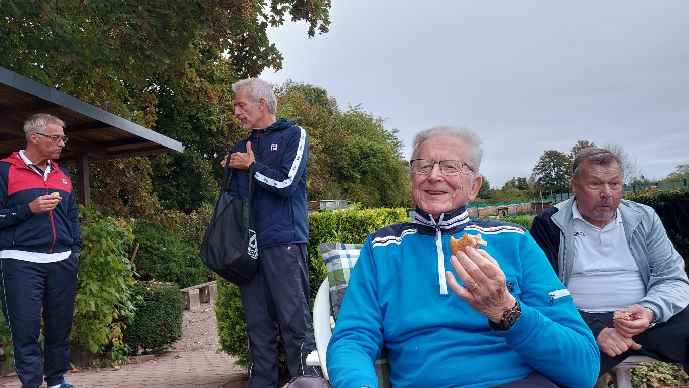 Pünktlich zum Ende des Turniers kam der angekündigte Regenschauer, der uns zum Essen und Trinken in den Container trieb. Ein reichhaltiges Buffet von mitgebrachten Salaten bis hin zu Kuchen sowie verschiedenen gegrillten Köstlichkeiten rundete ein gelungenes sportliches wie geselliges Ereignis ab. Danke allen, die dazu beigetragen haben.