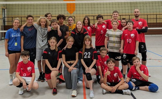 Auf dem Bild sehen wir unsere Lehrgangsteilnehmer, die sechs Lehrgangsgäste vom SV Langendreer 04, sowie die stolzen Trainer Meike (Langendreer) und Tim (Ruhrvolleys). Alle Teilnehmer haben mit großem Erfolg bestanden, sodass sie sich von nun an offiziell Schiedsrichter nennen dürfen.