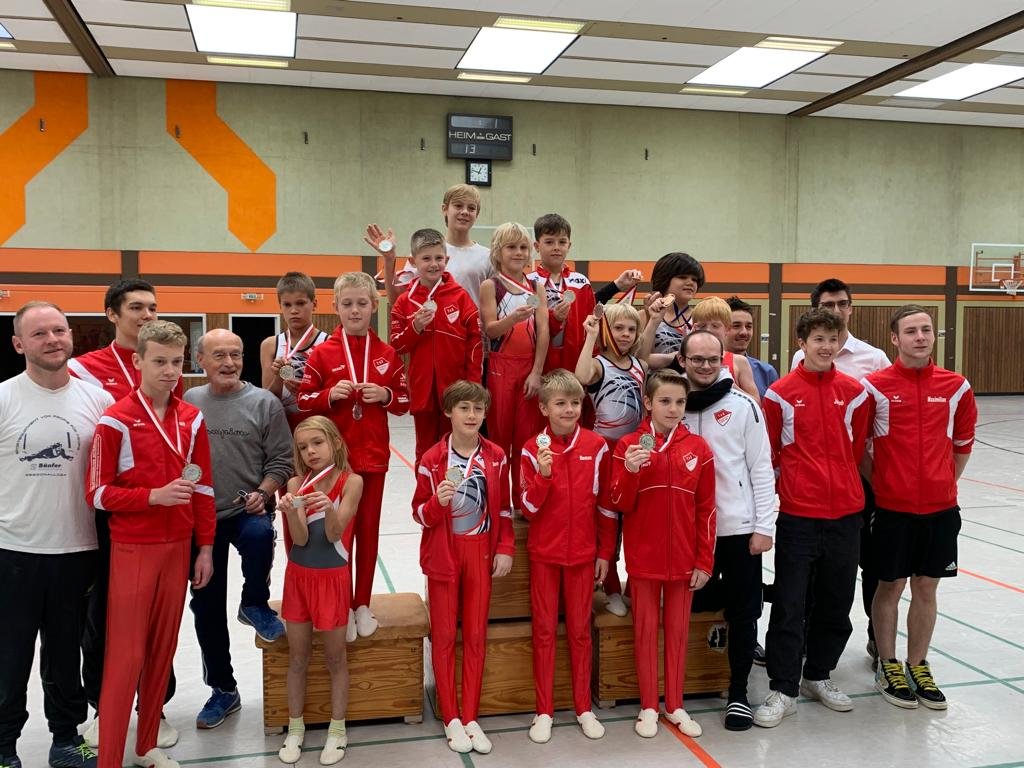 Ein wahres Feuerwerk zündeten die TuS-Minis, Schüler, Jugendturner und Turner in der Sporthalle Stockum bei den Bezirksgerätemeisterschaften ab. Einmal mehr zeigten die Stockumer Turner ihre ganze Klasse an den Geräten bei sehr guter Zuschauer-Kulisse , die Eltern mit viel Beifall für die Leistungen der Jungen an den Geräten somit honorierten. Organisator und Cheftrainer Peter Dekowski konnte mit seinem Trainerteam sehr zufrieden sein, die 19 Jungen zeigten ihre Qualitäten und derzeitiges Können an den Geräten in den AK- LK-Stufen und dem P-Programm. Leider gab es noch einige Absagen wegen Krankheit oder Verletzung. Wir Können gut 30 Jungen bei den Wettkämpfen alleine ohne Konkurrenz aus den anderen Vereinen stellen, die “Rot weißen Teufel „ sind daher über die Stadtgrenzen gefürchtet, wie Peter Dekowski betont. Die beiden jüngsten Bezirksmeister kamen aus 2 Programmen, Gabriel Lokas , Jahrg. 2015 turnte das erschwerte AK 7-Programm und wurde mit 53 Punkten neuer Bezirksmeister. In der AK 8 freute sich Nick König , Jahrg. 2014 Mit 57 Punkten über seinen Sieg. Bei den P-Stufen wurde Jonathan Bürger (Jahrg. 2015) bei seinem ersten Wettkampf Jüngster Sieger mit 47,30 Punkten. Im Vierkampf –P-Stufe, Jahrg. 2013/14 holte sich erstmalig Gold Hendrik Rother Mit 53,60 Pkt. gefolgt von Pepe Suerken (51,50) und Mika Daum (49,40). Sehr hohe Wertungen für eine gute Ausführung gab es für den Sieger in der Klasse, Jahrg. 2011/12 durch Maximilan Madel, der auf 56,60 Pkt. kam und mit drei guten 14 Wertungen überzeugte. Silber holte sich Simon Hesse mit 51,30 Pkt. Ohne Konkurrenz blieb Len Kliem , Jahrg. 08-10 der für 53,60 Pkt. ebenfalls sich über Gold freute. Die Gauliga-Turner turnten das LK-Programm, hier gab es Gold für Ben Heiler mit 40,70 Pkt. gefolgt von Mika Curstein (39,10)und Liam Reiter (38,40) im Jahrg. 09/10.