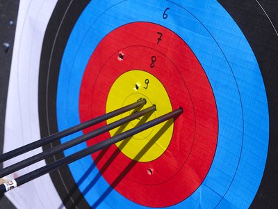 je 2 x 3 Pfeilen auf Scheiben in einer Diztanz von 25 m und