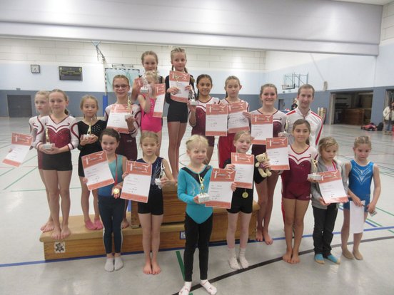 Hier die Stadt-Titelträger – P-Stufe - WK 1 – Daphne Becker 50,95 Pkt. – WK 2 – Johanna Kling 58,85 Pkt. – WK 3 Hannah Töbel 59,20 Pkt. – alle TuS Stockum . WK 4 – Adelajada Toskaj – DJK Annen – 58,40 – WK 5 – Elisa Brenneken / TuS Stockum – 57,25 Pkt. – WK 6 – Emma Fux TSG Sprockhövel 60,35 Pkt. – WK 7 – Louisa Riegel TSG Spr. 56,95 Pkt. – WK 8 – Valentina Hitzbleck TSG Spr. 60,75 Pkt. – LK-Stufe – WK 9 – Selina Ayaz – TuS Stockum – 47,20 Pkt. – WK 10 Nele Voigt TV Durchholz 45,40 Pkt. – WK 11 – Sofia Czoopdrowski DJK 44,85 Pkt. WK 13 – Mina Möhrke DJK 50,05 Pkt. – WK 14 Lisa Lendzian TuS Stockum 47,95 Pkt. Und WK 15 – Mia Dekowski TuS mit 48,30 Pkt. sich über Gold und Pokale freuen. Eine Bestleistung gab es in der P-Stufe von Hannah Töbel am Boden mit 16 Punkten. Am Sprung LK-Stufe Hannah Meyer mit 12,70 Pkt sowie am Boden von Mina Möhrke mit 14,20 Pkt.