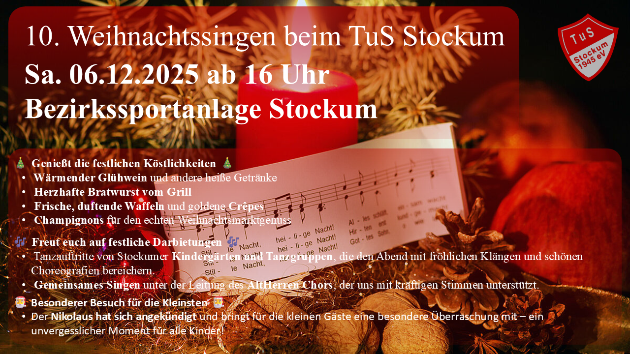 Am Samstag, den 06.12.2025, findet zum 10. Mal das traditionelle Weihnachtsingen auf der Bezirksportanlage an der Pferdebachstraße in Stockum statt.