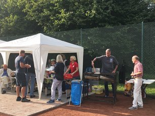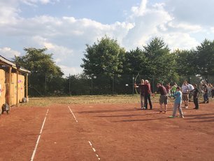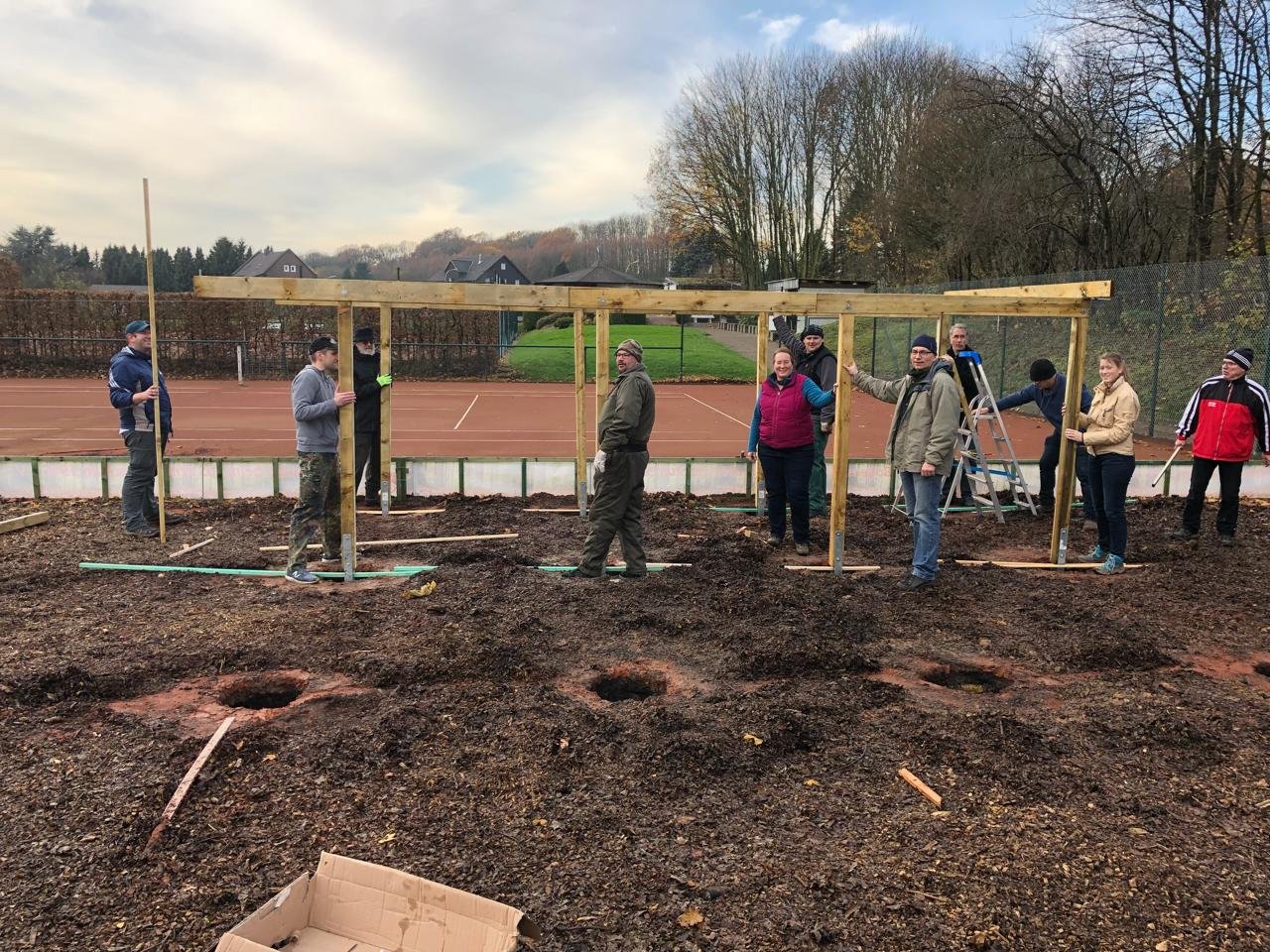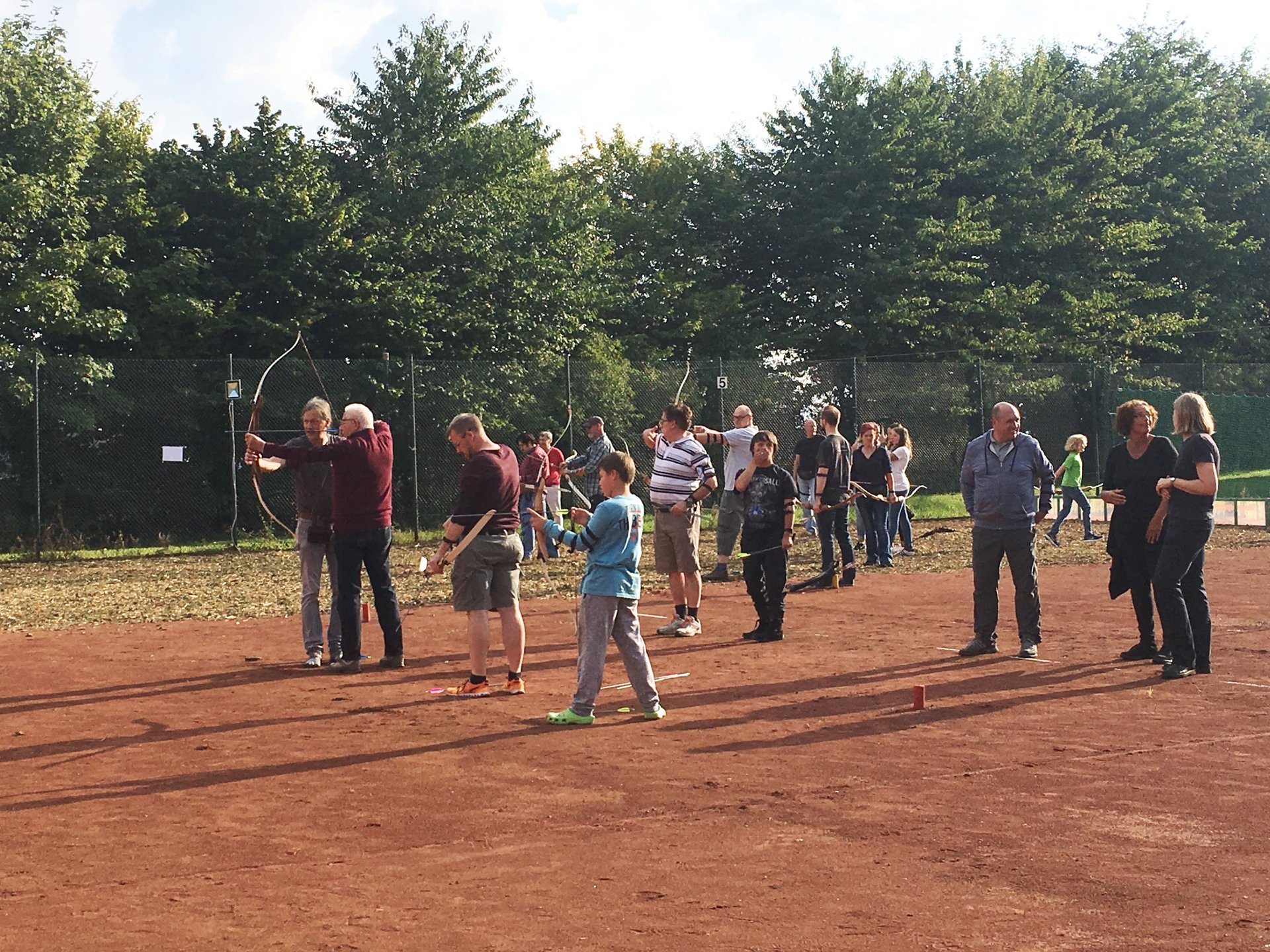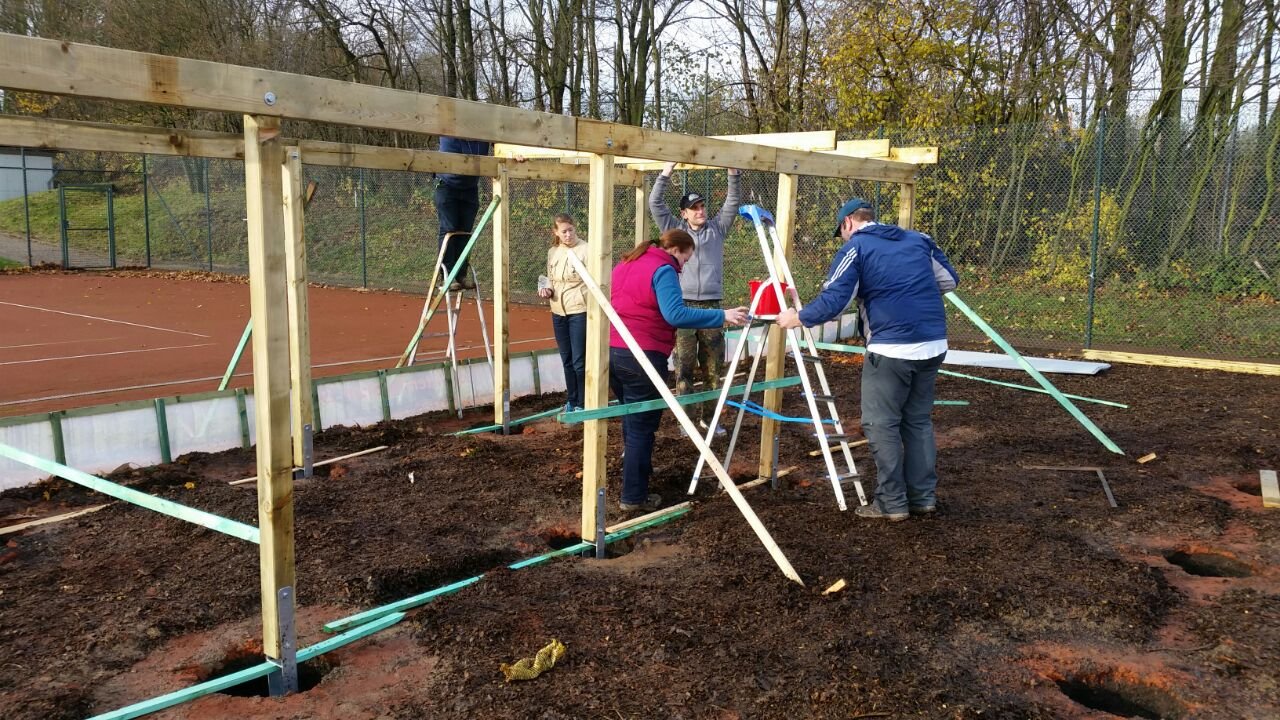In drei Monaten wurde aus einem Tennisplatz eine professionelle Bogensport-Anlage. Der Untergrund wurde komplett mit Mulch bedeckt, zwei überdachte Schießstände entstanden, Beleuchtung wurde angebracht, eine eigene Holzhütte wurde gebaut und gestrichen, und ein Carport als überdachte Terrasse zum Zuschauen und Verweilen wurde errichtet. Ein Beweis dafür, was möglich ist, wenn viele Hände mit gleichem Interesse zu Werke gehen.