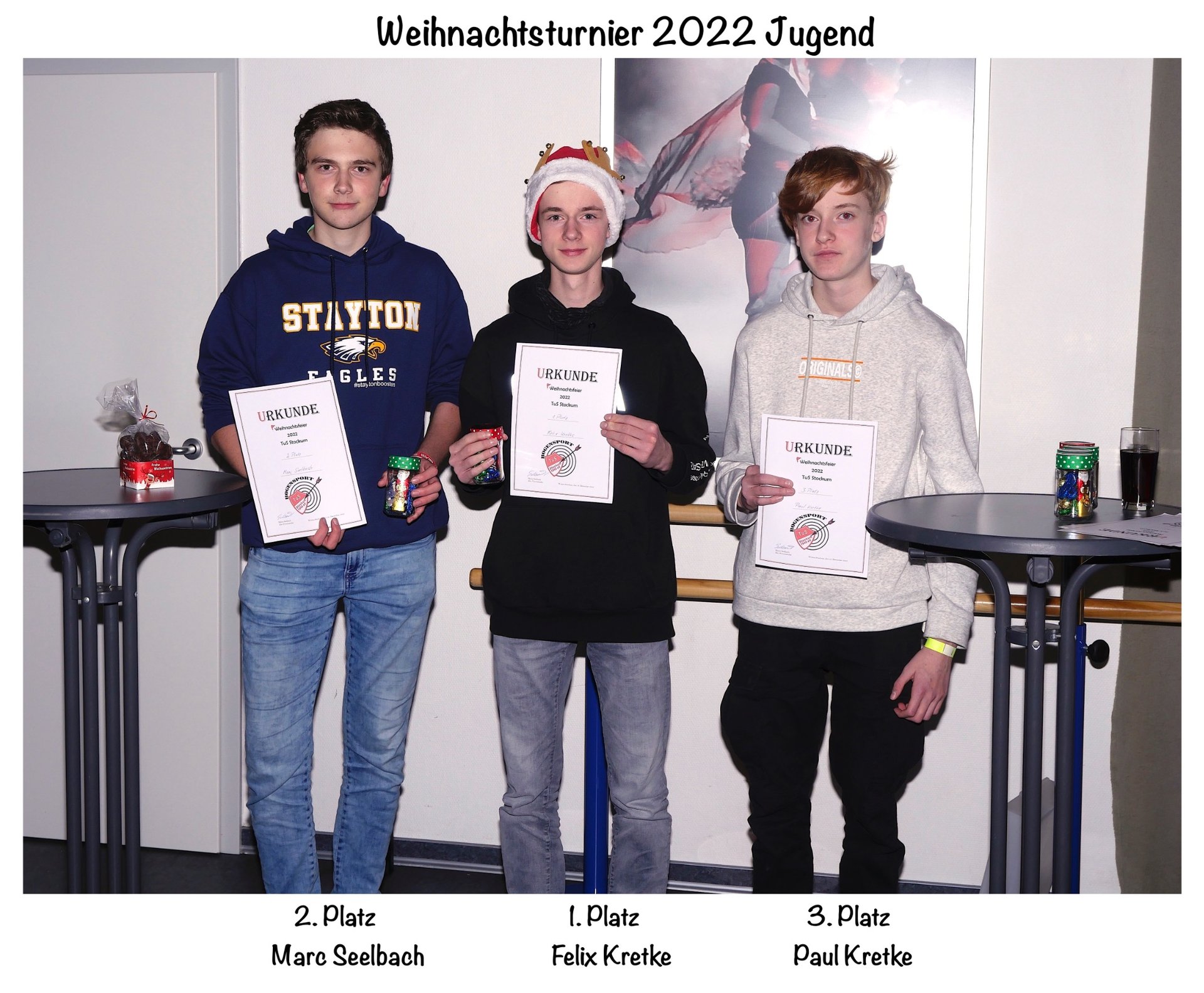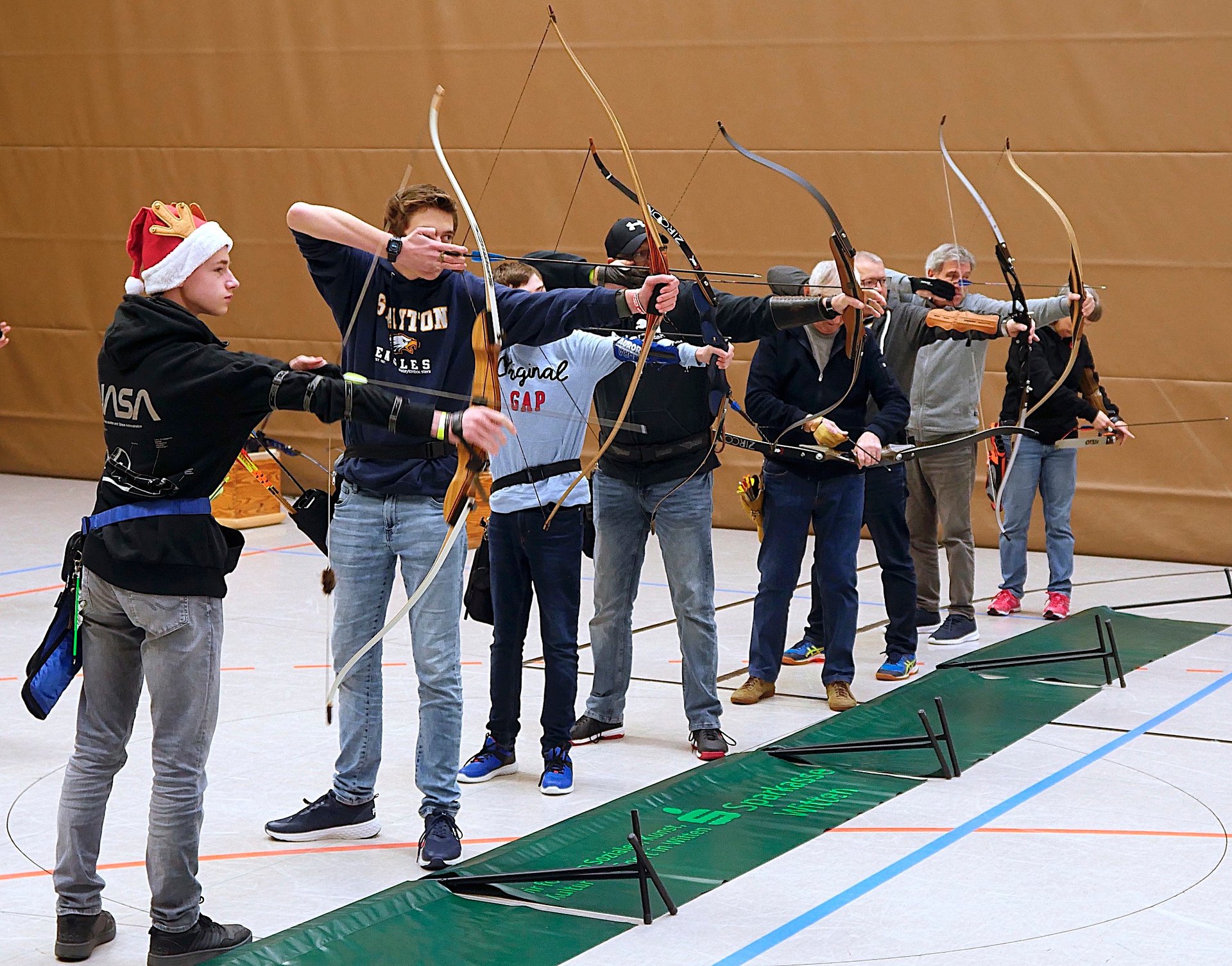 Zu unserer diesjährigen Weihnachtsfeier der Abteilung Bogensport, die am 10. Dezember stattfand, hatten sich über 85 Bogenschütze in unserer Sporthalle versammelt, davon 21 Erwachsene und 12 Kinder, die an dem Turnier teilnehmen wollten und die anderen, der die Turnierteilnehmer tatkräftig unterstützen wollten. Nach guten drei Stunden Wettkampf standen die Sieger und Siegerinnen fest, wie oben zu sehen ist. Anschließend fand in gemütlicher Runde die Siegerehrung statt und das reichhaltige Buffet half einen „leckeren“ und gemütlichen Abend zu verbringen.